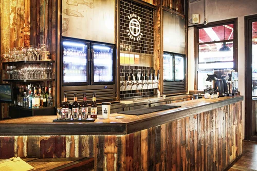 该品牌的定西路位置是三个装修完成后的第一个,它侧重于一个开放的酒吧和一系列的座位经验,支持一个共同的经验。水龙头墙王空间被简化为黑色瓷砖图案已经有所放在定制的水龙头把手溅满了一系列的颜色,代表着不同的啤酒,在一个新的创新的啤酒品尝系统。原材料、热轧钢材、传统的中国砖和回收的榆木木材为舒适的家具创造了背景,也洒上了匹配的颜色。